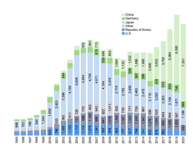 在 2016 年至 2020 年期間,氫燃料電池領(lǐng)域的專利申請增長了近四分之一(23.4%)。2020 年,中國的創(chuàng)新者申請量最高,為 7261 件,占總數(shù)的 69%;其次是日本(1186 件申請,占總數(shù)的 11.3%);德國(646 件,占總數(shù)的 6.2%);韓國(583 件,占總數(shù)的 5.6%)以及美國(403 件,占總數(shù)的 3.8%)。