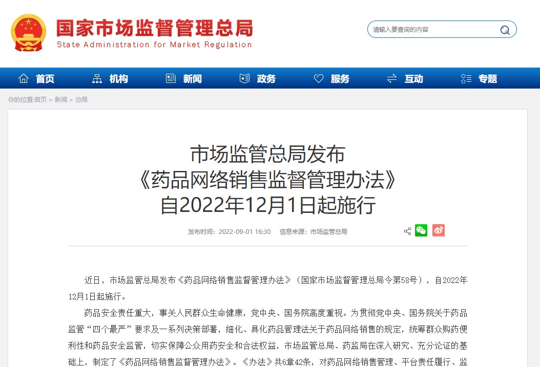 9 月初,國(guó)家市場(chǎng)監(jiān)督管理總局發(fā)布《藥品網(wǎng)絡(luò)銷(xiāo)售監(jiān)督管理辦法》(以下簡(jiǎn)稱(chēng)《辦法》),對(duì)藥品網(wǎng)絡(luò)銷(xiāo)售管理、平臺(tái)責(zé)任履行、監(jiān)督檢查措施及法律責(zé)任作出了規(guī)定,并明確自 2022 年 12 月 1 日起施行。