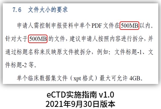 eCTD實施指南 v1.1 (修訂版征求意見稿)中將章節7.6中的單個文件大小從“500 MB”調整為“200 MB”