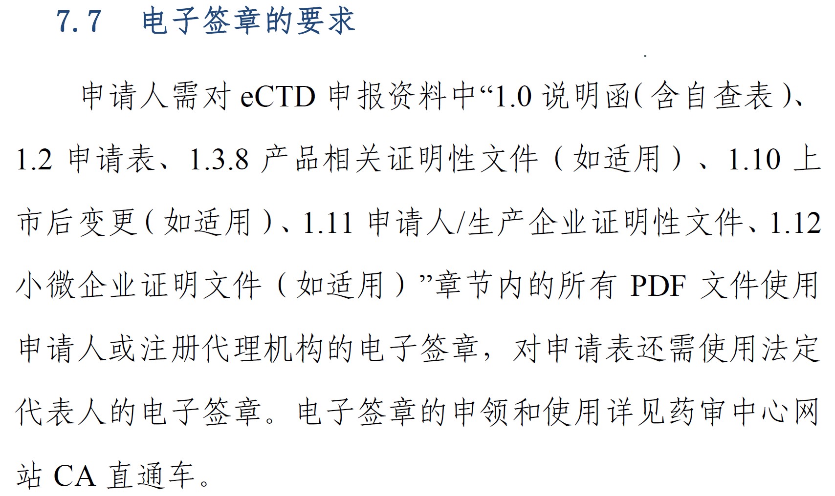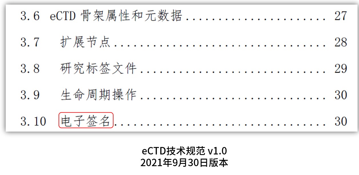 eCTD技術規范 v1.1 (修訂版征求意見稿)以及eCTD實施指南 v1.1 (修訂版征求意見稿)將“電子簽名”調整為“電子簽章”,與現行其他法規一致。