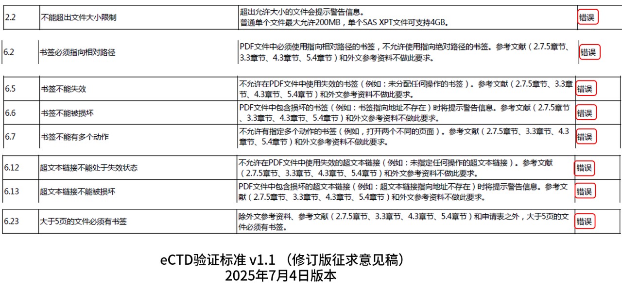 eCTD驗證標準 v1.1 (修訂版征求意見稿)中將8項與PDF相關的驗證項的嚴重程度從“警告”提升到“錯誤”
