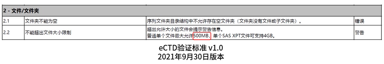 eCTD驗證標準 v1.1 (修訂版征求意見稿)中將2.2項中的單個文件大小從“500 MB”調整為“200 MB”