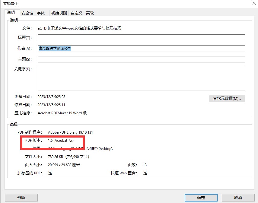 在工具欄中“文件-屬性”中查看PDF版本,1.4-1.7為符合遞交規范要求的版本。