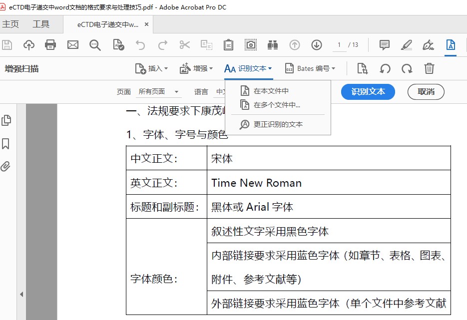根據CDE要求,除去一些豁免文件外,對于掃描后創建的PDF文件應啟動光學字符識別功能,確保內容可復制、可搜索。簡單來說,能通過OCR操作可以把掃描的文件從非文本格式識別成文本格式,使掃描文件中的文本可以被檢索查找。