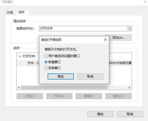外部書簽的創建,需要對新建的書簽進行屬性設置,右鍵-屬性,將原有動作刪除后,點擊“動作-跳至頁面視圖”,點擊添加,打開目標文件找到目標頁,點擊“設置鏈接”按鈕。彈出書簽屬性框,點擊“動作-選擇動作-打開文件”,指定打開首選項選擇“新建窗口”點擊確定,使用頁碼選擇“承前縮放”,即可完成外部書簽的創建。