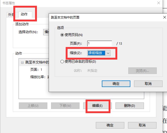 ICH規定將所有書簽屬性設置為“承前縮放”,點擊需要設置屬性的書簽,右鍵-屬性-動作-編輯-縮放,選擇“承前縮放”。
