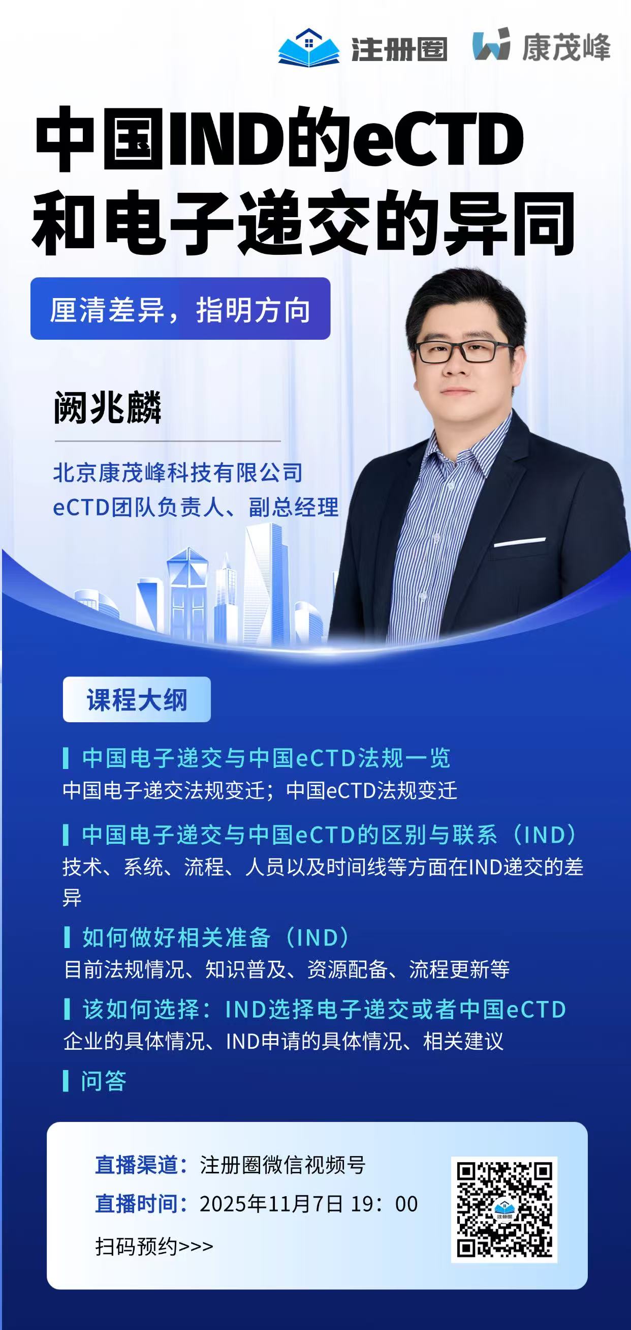 2025年11月7日,康茂峰公司副總經(jīng)理、eCTD業(yè)務(wù)負(fù)責(zé)人闕兆麟先生受邀出席醫(yī)藥注冊(cè)領(lǐng)域權(quán)威平臺(tái)“注冊(cè)圈”的直播活動(dòng),圍繞《中國(guó)IND的eCTD和電子遞交的異同》主題展開(kāi)深度分享。本次直播吸引了超三千名醫(yī)藥研發(fā)與注冊(cè)領(lǐng)域?qū)I(yè)人士在線參與,現(xiàn)場(chǎng)互動(dòng)熱烈,展現(xiàn)了行業(yè)對(duì)藥品電子化遞交政策的高度關(guān)注。