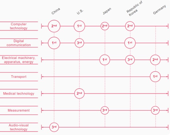 據產權組織統計數據庫的消息,中國和韓國的申請人在數字通信領域的專利申請較為密集,而美國的申請人在計算機技術領域申請的專利最多。對日本來說,頂尖的技術領域是電機,而對德國來說則是交通運輸。